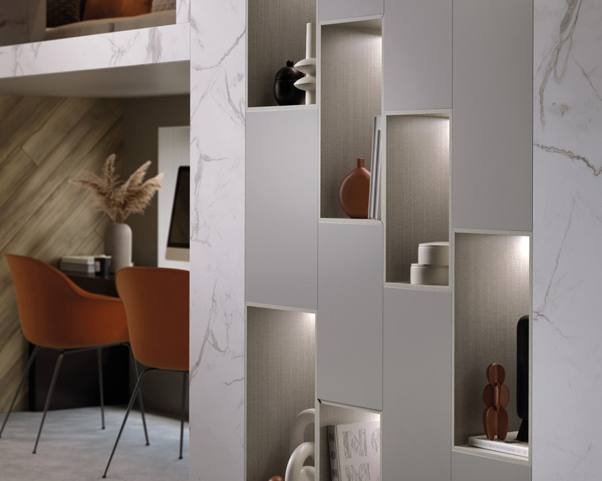 Pluton is a versatile, non-directional finish with a matte effect. Ideal for both vertical and horizontal surfaces, Pluton is inviting to the touch and enhances bolder textiles and decors.